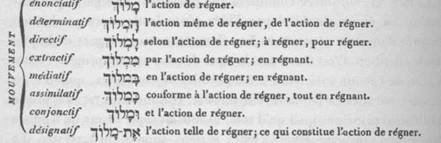 J’ai une observation très-importante à faire sur cette inflexion verbale. Elle regarde l’article conjonctif . Cet article, qui, placé au-devant du Verbe nominal, n’exprime que le mouvement conjonctif, comme dans l’exemple ci-dessus, prend toute la force du signe convertible devant le temps futur ou passé de ce même Verbe, et change leur modification temporelle de telle sorte, que le temps futur devient passé, et que le temps passé prend tout le caractère du futur. Ainsi, par exemple, le futur il sera, change brusquement de signification en recevant l’article conjonctif , et devient le passé et il fut: ainsi le passé il était, perd également son sens originel en prenant le même article , et devient le futur et il sera."