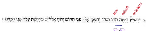 2. Et-la-terre existait puissance-contingente-d’être dans-une-puissance-d’être: et-l’obscurité (force compressive et durcissante) -était sur-la-face de-l’abìme (puissance universelle et contingente d'être); et-le-souffle de-lui-les-Dieux (force expansive et dilatante) était-générativement-mouvant sur-la-face des-eaux (passivité universelle)". V.1 |