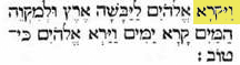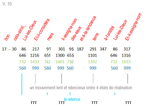 Et-il-assigna-nom, Lui-Ies-Dieux, à-l’aridité, terre (élément terminant et bornant); et-à-la-tendance des-eaux, il-assigna-nom, mers (immensité acqueuse, manifestation de l’universelle passivité) : et-il-considéra, Lui-les-Dieux, cela- ainsi bon. |