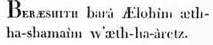 1. PREMIEREMENT-EN-PRINCIPE, il-créa, Ælohîm (il détermina en existence potentielle, Lui -les-Dieux, l'Être-des-êtres), l’ipséité-des-cieux et-l’ipséité-de-la-terre.