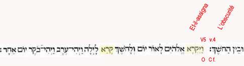 Et-il-assigna-nom, Lui-les- Dieux, à-la-lumière, Jour (manifestation universelle) ; et-à-l’obscurité,il-assigna-nom Nuit (négation manifestée, nutation des choses) : et-fut-occident, et-fut-orient (libération et itération) ; Jour premier (première manifestation phénoménique).