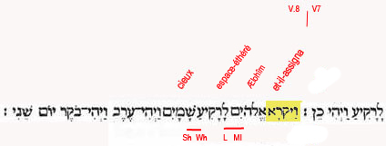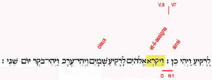 8. Et-il-assigna-nom, Lui-l'Être-des-étres à-l’espace-éthéré, Cieux (les eaux éclatantes, élevées) : et- fut-occident, et-fut-orient (libération et itération). Jour, second (seconde manifestation phénomnique). |