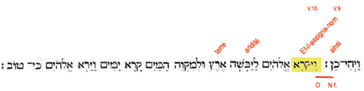 Et-il-dit, Lui-les-Dieux, elles tendront-fortement ( inclineront, se détermineront par un mouvement irrésistible) les-eaux par-en-bas (de l’affaissement) -des-cieux, vers un-lieu-déterminé, uniquej et se-verra-l’aridité : el-ce-fut-ainsi. |