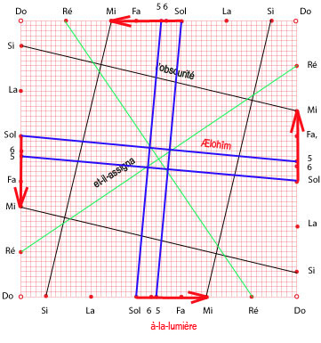 La racine AL est le symbole de la force excentrique. Dans un sens restreint, c’est tout ce qui tend à un but, représenté par les relations désignatives ou adverbiales à , vers, pour, par, contre, sur, dessus; etc.. Avec LE, analogue à la rac. LA (cette racine est le symbole de la ligne prolongée à l’infini, du mouvement sans terme, de l’action dont rien ne borne la durée : de là, les idées opposées, d’être et de néant), , renferme l’idée d’une direction donnée à la vie, d’un mouvement sans terme. |