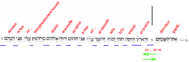 2. Et-la-terre existait puissance-contingente-d’être dans-une-puissance-d’être: et-l’obscurité (force compressive et durcissante) -était sur-la-face de-l’abìme (puissance universelle et contingente d'être); et-le-souffle de-lui-les-Dieux (force expansive et dilatante) était-générativement-mouvant sur-la-face des-eaux (passivité universelle)". |