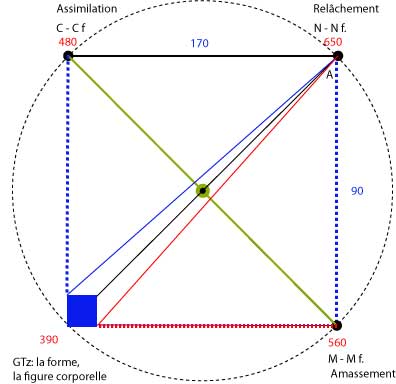 Les champs d'action représéntés ici par les lettes sont: A final ( signe de la réalisation) dans créa (1) , C final (signe de la force contractante) dans et-l'obscurité (6), M final ((signe de la pluralité, de l'amassement): Lui-les-Dieux (2), (8), (10) l'abîme (7) , des-cieux (3), des-eaux (9) , Tz final (signe du mouvement arrivant à son terme, un déploiement): de-la-terre (4) , et-la-terre (4)