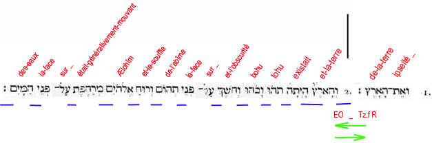 2. Et-la-terre existait puissance-contingente-d’être dans-une-puissance-d’être: et-l’obscurité (force compressive et durcissante) -était sur-la-face de-l’abìme (puissance universelle et contingente d'être); et-le-souffle de-lui-les-Dieux (force expansive et dilatante) était-générativement-mouvant sur-la-face des-eaux (passivité universelle)". |