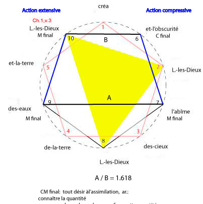 Les champs d'action représéntés ici par les lettes sont: A final ( signe de la réalisation) dans créa (1) , C final (signe de la force contractante) dans et-l'obscurité (6), M final ((signe de la pluralité, de l'amassement): Lui-les-Dieux (2), (8), (10) l'abîme (7) , des-cieux (3), des-eaux (9) , Tz final (signe du mouvement arrivant à son terme, un déploiement): de-la-terre (4) , et-la-terre (4)