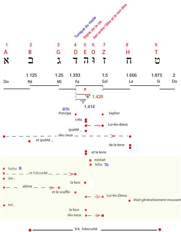 Ceuc-ci se terminent ainsi: " Et-il-dit, Lui-l'Être-des-être: sera-faite-lumière; et- (sera) - fut faite lumière". S'agissant non pas de lumière au sens noderne du terme, mais de lumière réfléchie, comme l'indique la composition du terme "dire" (Et-dit), l'on est amené à écrire qu'il s'agit là d'un objet, de l'univers en tant que "objet" dont Lui-les-Dieux, la mouvement d'extension sur lui-même) forme la trame, la mesure.