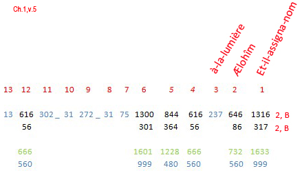 5. Et-il-assigna-nom, Lui-les- Dieux, à-la-lumière, Jour (manifestation universelle) ; et-à-l’obscurité, il-assigna-nom Nuit (négation manifestée, nutation des choses) ; et-fut-occident, et-fut-orient (libération et itération) ; Jour premier (première manifestation phénoménique). |