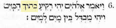 6. Et-il-dit, Lui-les-Dieux, il sera fait une-raréfaction (un desserrement, une force raréfiante) au-centre des-eaux : et-il-sera-fait un-faisant-séparer (un mouvement de séparation) entre-les-eaux envers-les-eaux. |