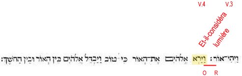 v. 4- OIRA Et-il-considéra...... Moyse continue à faire parler l’Être des êtres, le créateur universel, au futur, en tournant l’expression de sa volonté au passé, au moyen du signe convertible. C’est une chose sur laquelle je n’insisterai plus, la supposant assez connue du Lecteur. Le verbe RA°OTh dont Moyse se sert en cette occasion, ne signifie pas seulement voir, mais considérer, en dirigeant volontairement le rayon visuel sur un objet. La racine R.O ou RI, composée du signe du mouvement propre réuni au convertible ou à celui de la manifestation, développe toute idée de raie, de rayon, de trace, de chose quelconque se dirigeant en ligne droite. Elle se joint à la racine , A.O ou AI, exprimant le but, le lieu, l’objet vers lequel incline la volonté, là où elle se fixe; et forme avec elle, le composé RAI, RAE, RA°OTh» c’est-à-dire, la vision, l’action de voir, et l’objet même de cette action.