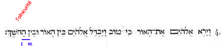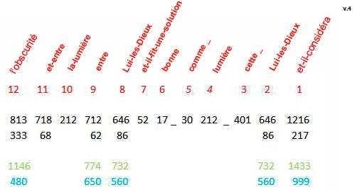 Et-il-considéra,Lui-les-Dieux, celle lumière comme bonne ; et-il-fìt-une-solution (il determina un moyen de séparation) Lui-les-Dieux, entre la-lumière (élémentisation intelligible ) et entre l’obscurité (force compressive et durcissanle). |