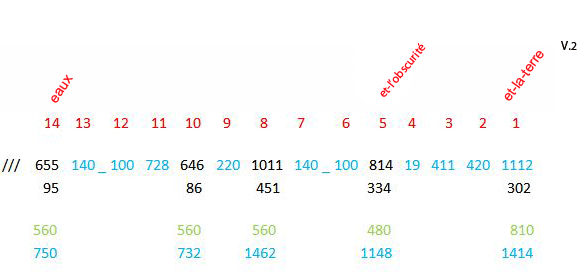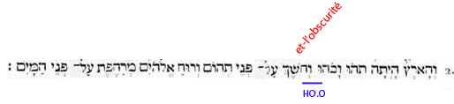 Et-la-terre existait puissance-contingente-d’être dans-une-puissance-d’être: et-l’obscurité (force compressive et durcissante) -était sur-la-face de-l’abìme (puissance universelle et contingente d'être ); et-le-souffle de-lui-les-Dieux (force expansive et dilatante) était-générativement-mouvant sur-la-face des-eaux (passivité universelle). |