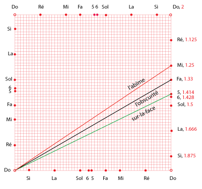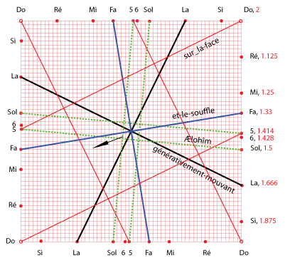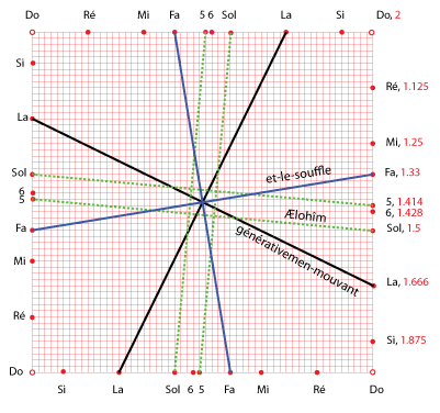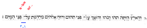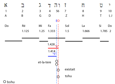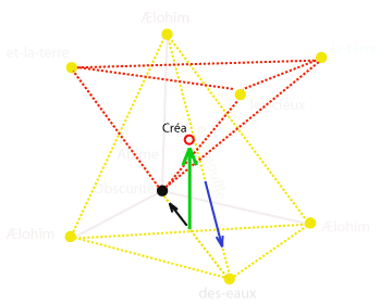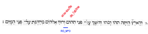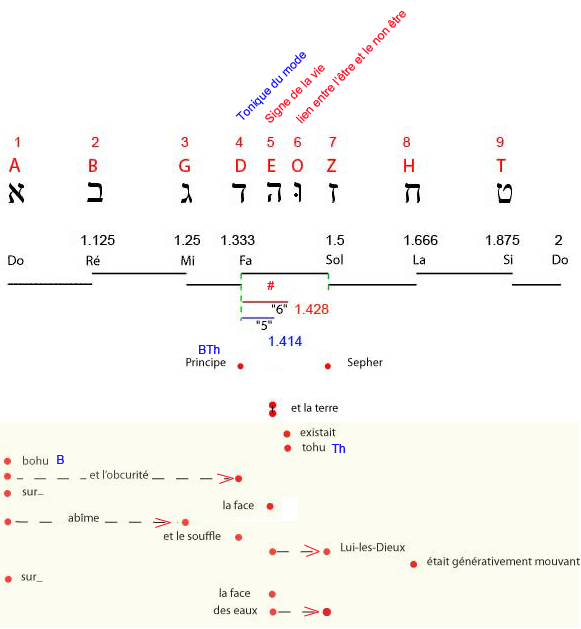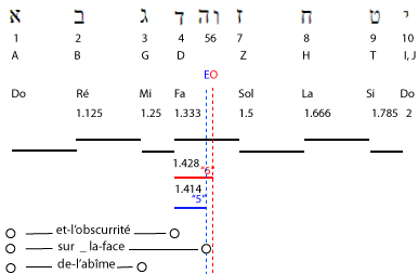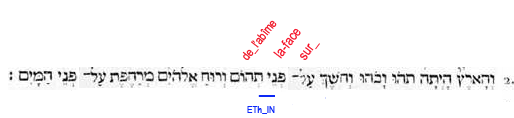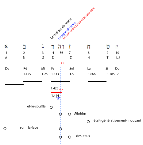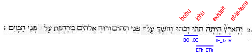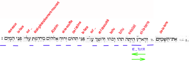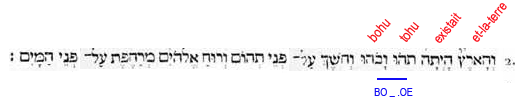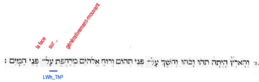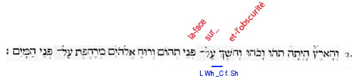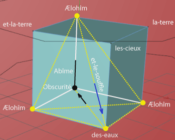 2. Et-la-terre existait puissance-contingente-d’être dans-une-puissance-d’être: et-l’obscurité (force compressive et durcissante) -était sur-la-face de-l’abìme (puissance universelle et contingente d'être); et-le-souffle de-lui-les-Dieux (force expansive et dilatante) était-générativement-mouvant sur-la-face des-eaux (passivité universelle)". |