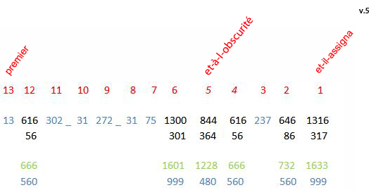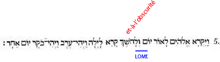 Et-il-assigna-nom, Lui-les- Dieux, à-la-lumière, Jour (manifestation universelle) ; et-à-l’obscurité, il-assigna-nom Nuit (négation manifestée, nutation des choses) : et-fut-occident, et-fut-orient (libération et itération) ; Jour premier (première manifestation phénoménique). |