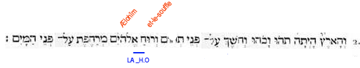 I. PREMIEREMENT-EN-PRINCIPE, il-créa, Ælohîm (il détermina en existence potenlielle, Lui -les-Dieux, l'Être-des-êtres), l’ipséité-des-cieux et-l’ipséité-de-la-terre. V.1 |
