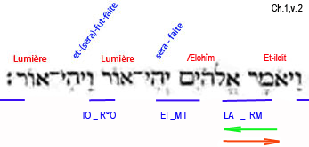 Cette action de contrainte, cette force provoque un déchirement (ch..1,v2) dans ce qui est nommé Principe (In Principio. Vulgate). Cette action est répétée trois fois, permettant de faire apparaître ce qui est nommé "lumière".