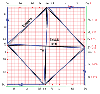 La terre en tant que puissance d'être (tohu bohu) peut être figurée par un champ carré potentiel, "haché" sous l'effet d'un mouvement de vibration de type reptiforme, ce qui a permit d'affirmer par certains commentateurs qu'elle était inanimée et vide (Vulgate).